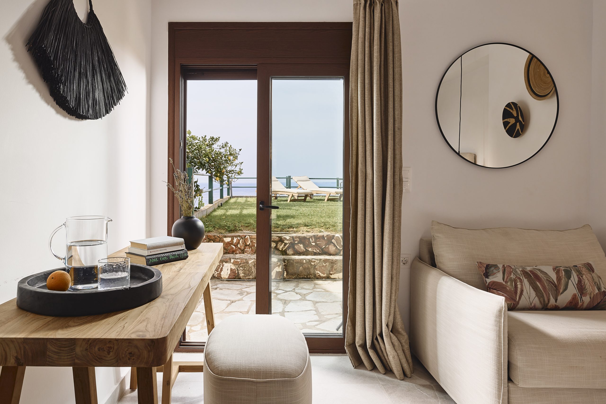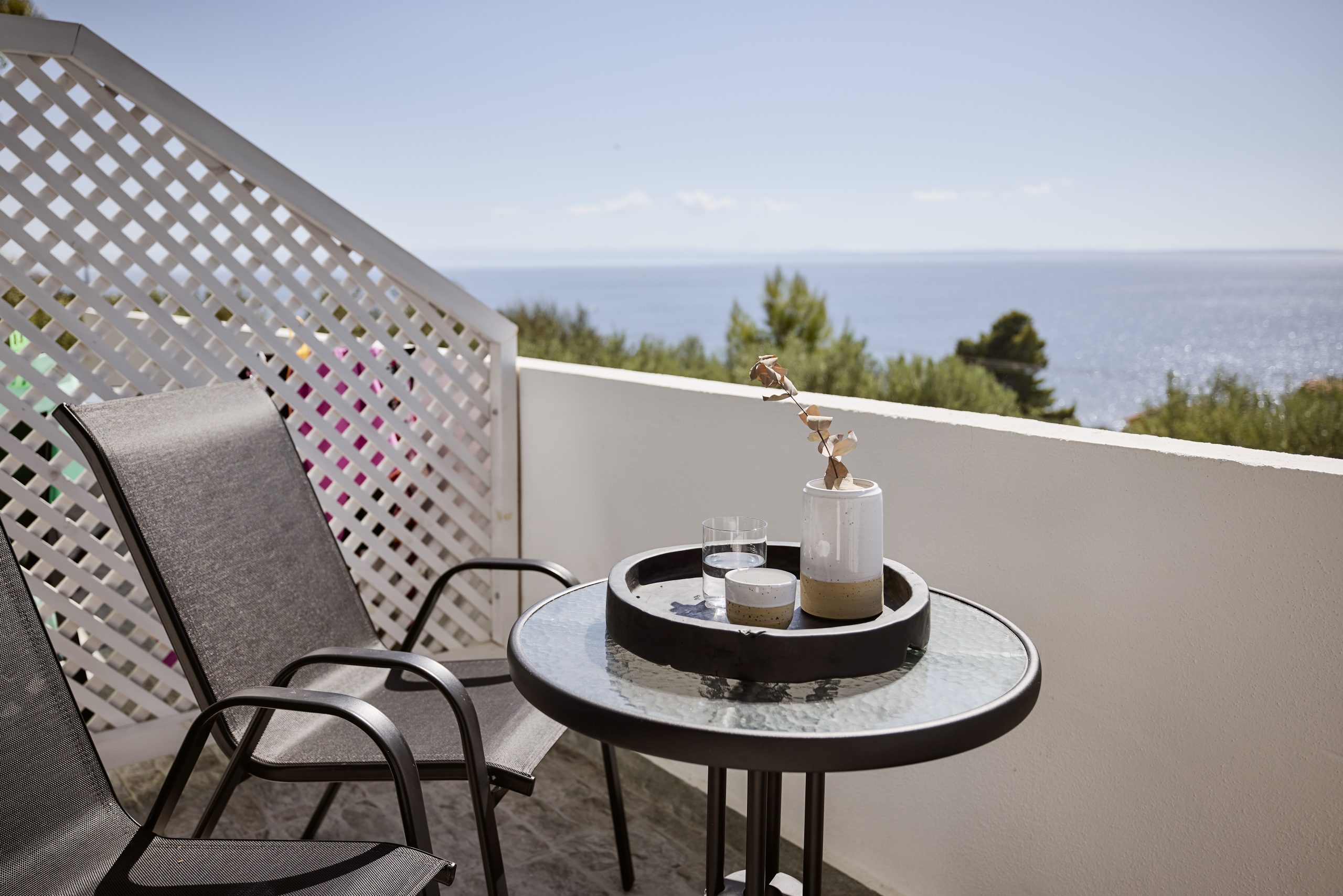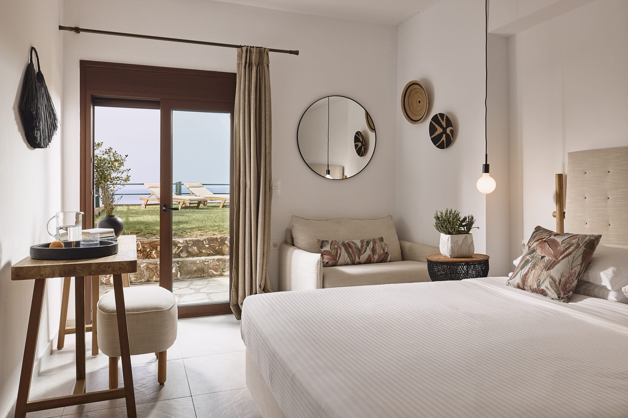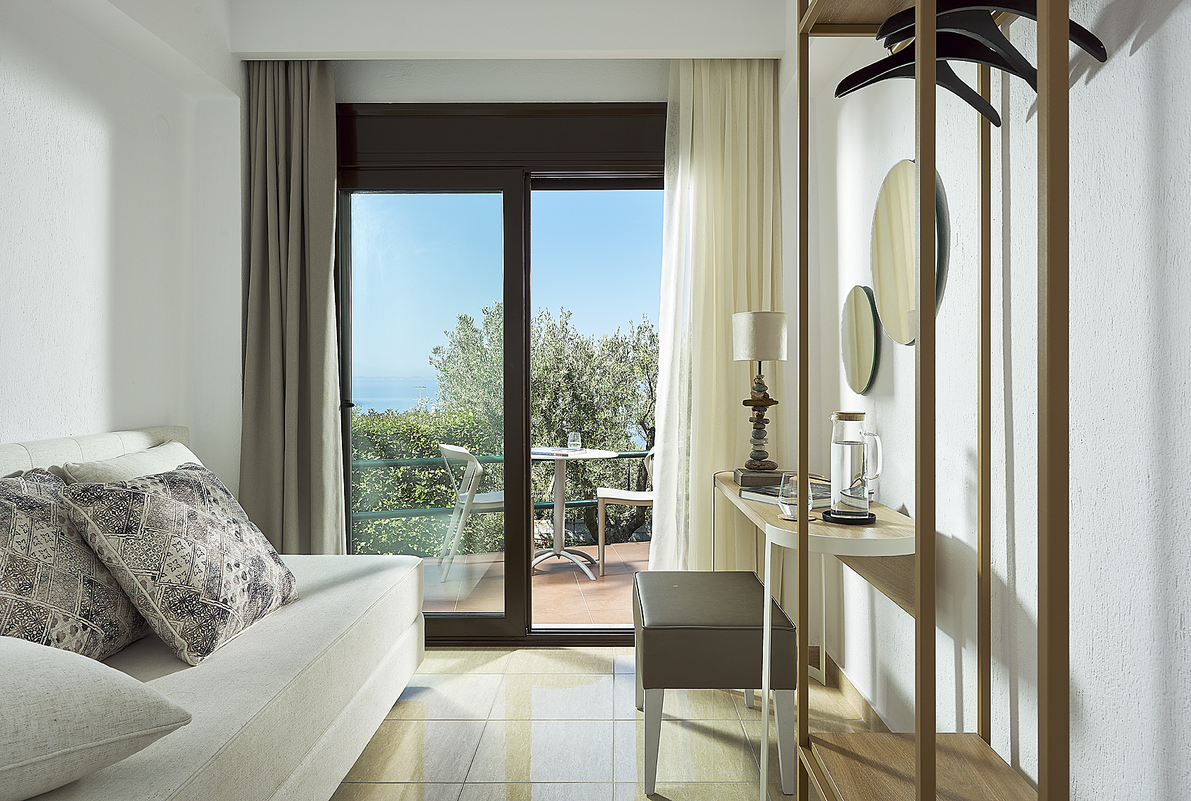 This cozy 27 sqm suite offers more space than the superior double room, featuring a queen-size bed and a single bed. It also includes a private balcony with stunning views of either the Toroneos Gulf or the garden.