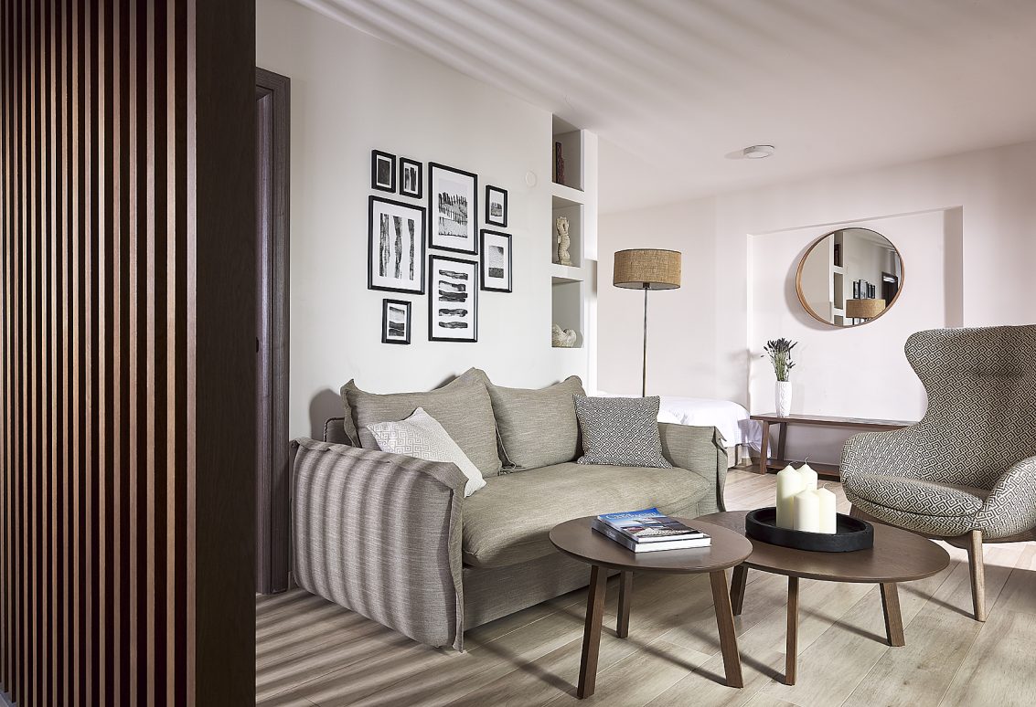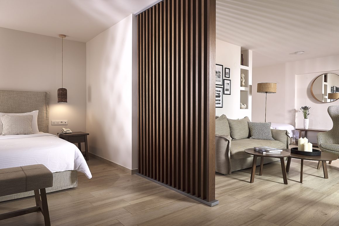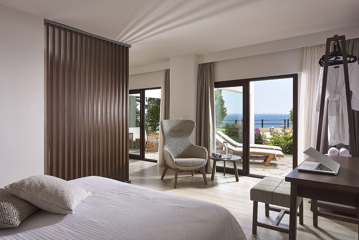 This spacious 50 sqm suite is the largest at Glavas Inn and features the sunniest patio with breathtaking views of the Toroneos Gulf, seamlessly blending indoor and outdoor living. The private patio, furnished with loungers, offers the perfect spot for sunbathing or enjoying a peaceful sunset. Inside, the suite provides two bedrooms for added privacy: the first bedroom includes a queen-size bed, while the second has two twin-size beds. A separate living room area offers a cozy space to relax and enjoy your morning book. Guests can also enjoy the convenience of on-site private parking with this room.