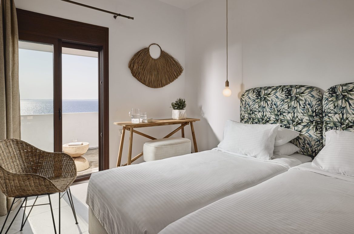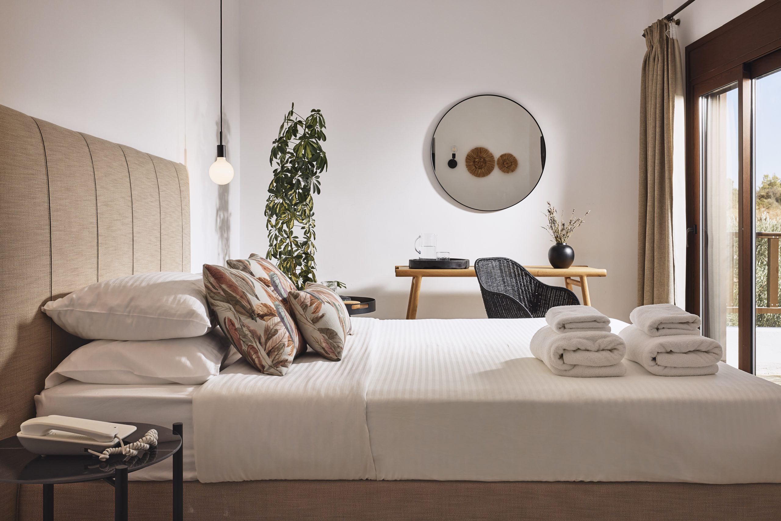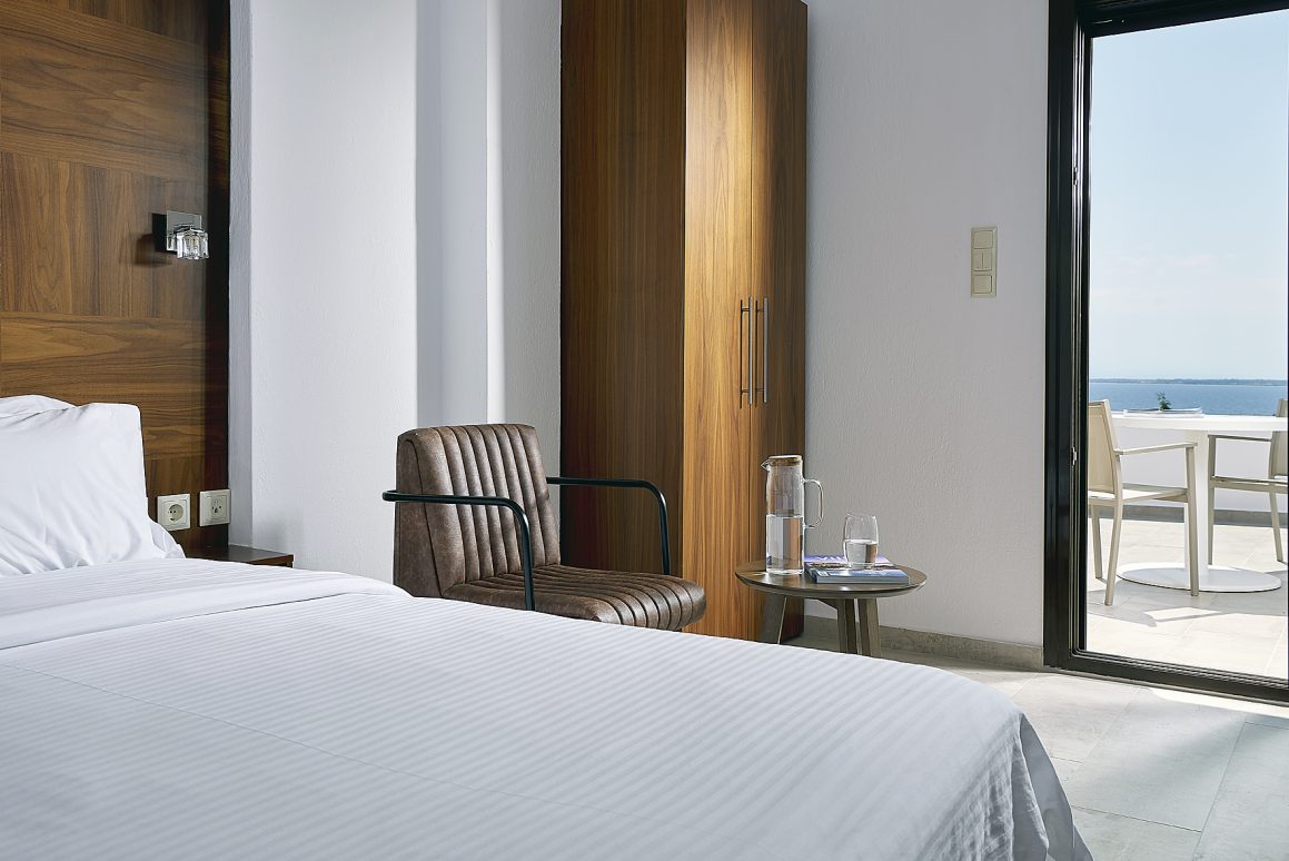 Ideal for couples or friends seeking relaxation, this room type features either a queen-size bed or two twin-size beds. These spacious 22 sqm rooms include a private balcony with stunning views of the Toroneos Gulf or garden view.