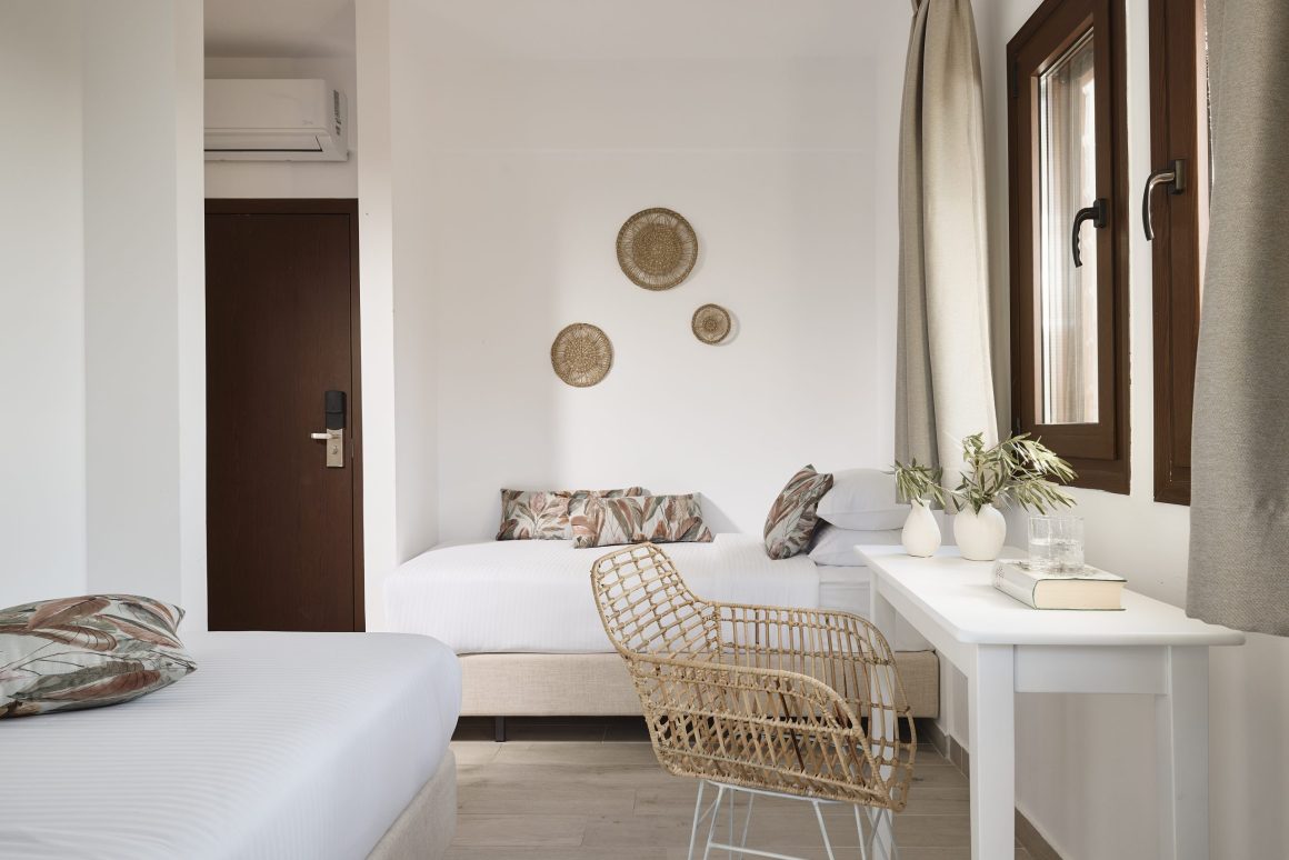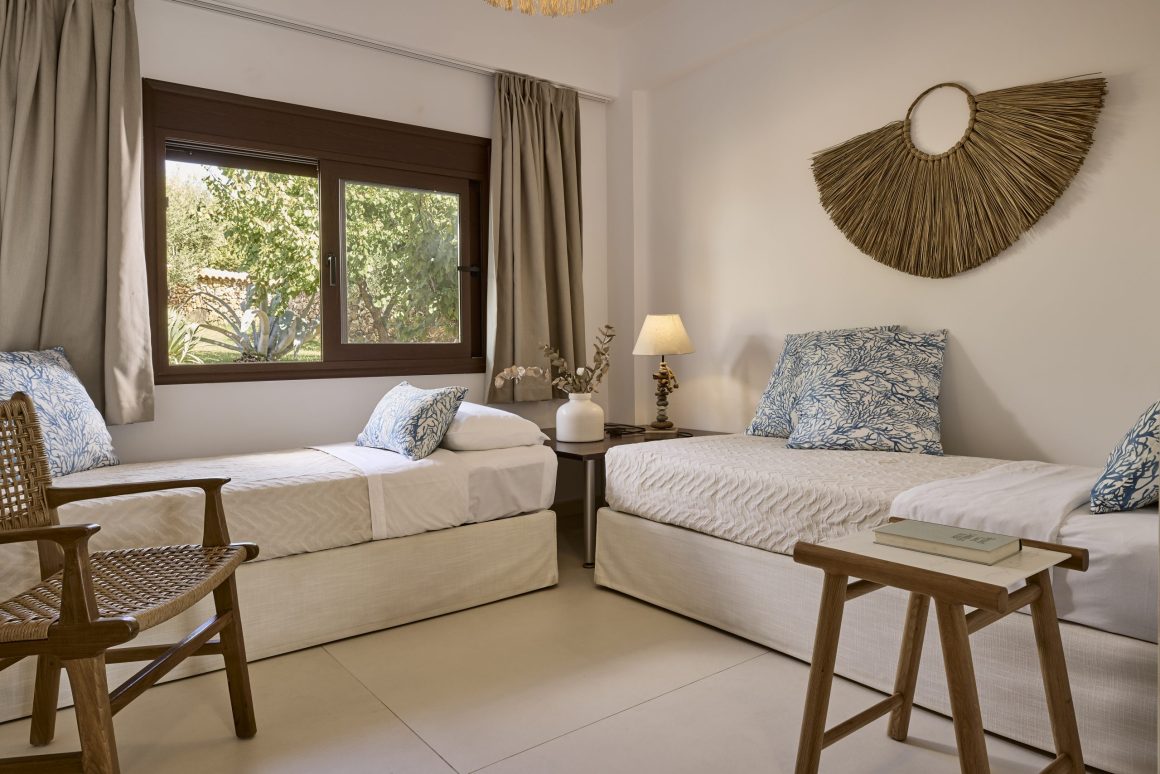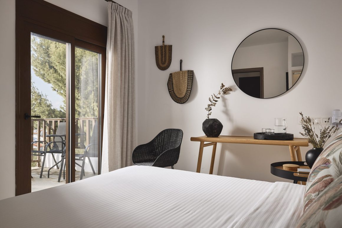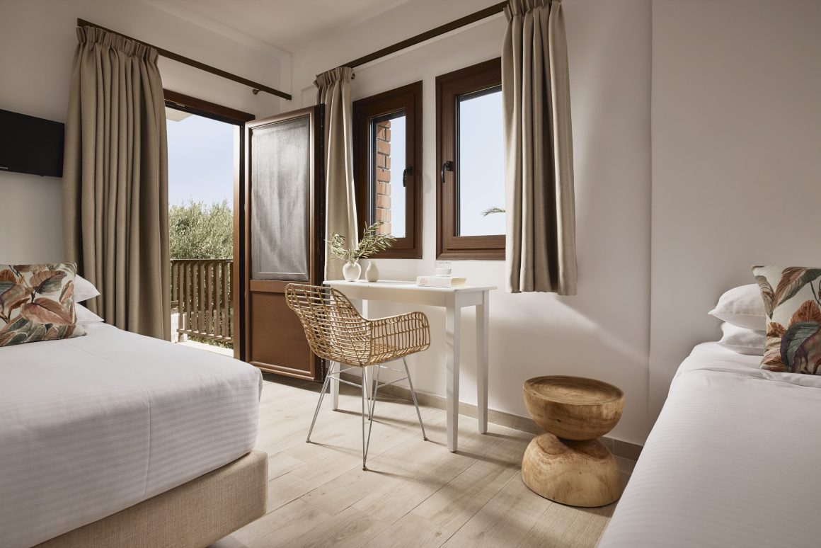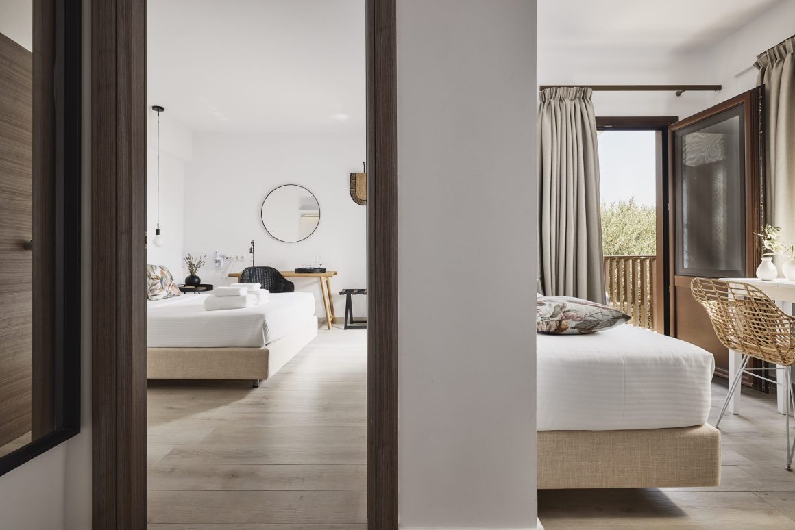 Ideal for families, this room type features two bedrooms for added privacy. The first bedroom includes one queen-size bed, and the second bedroom features two twin-size beds. These spacious 42sqm rooms include a private balcony with stunning views of the Toroneos Gulf or garden view.