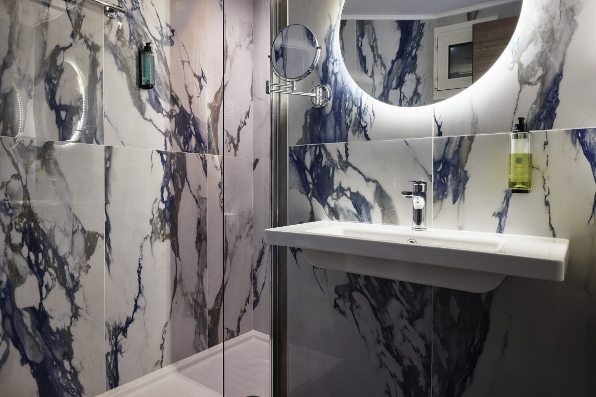 - Custom-crafted furnishings and marble surfaces in the bathroom.